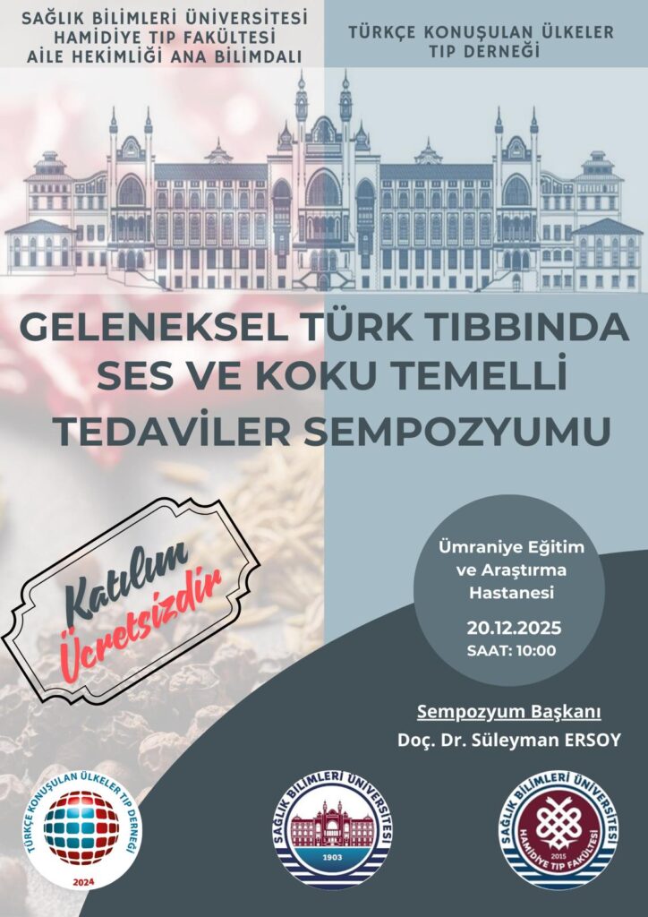 Türkçe Konuşulan Ülkeler Tıp Derneği ve Sağlık Bilimleri Üniversitesi Hamidiye Tıp Fakültesi Aile Hekimliği Anabilim Dalı iş birliği ile gerçekleştirilecek olan “Geleneksel Türk Tıbbında Ses ve Koku Temelli Tedaviler” sempozyumuna sizleri davet etmekten mutluluk duyuyoruz.
